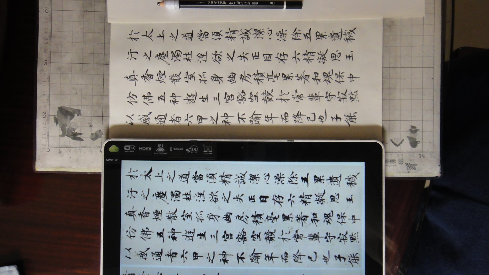 本相片因側光,可見落筆需有相當的力道,才能寫出毛筆式的鉛筆書法。